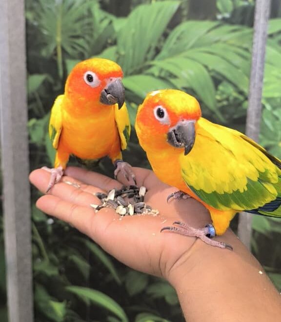 Sun Conures are bright, vibrant birds with stunning yellow, orange, and green feathers. Their bold colors and lively personalities make them stand out.